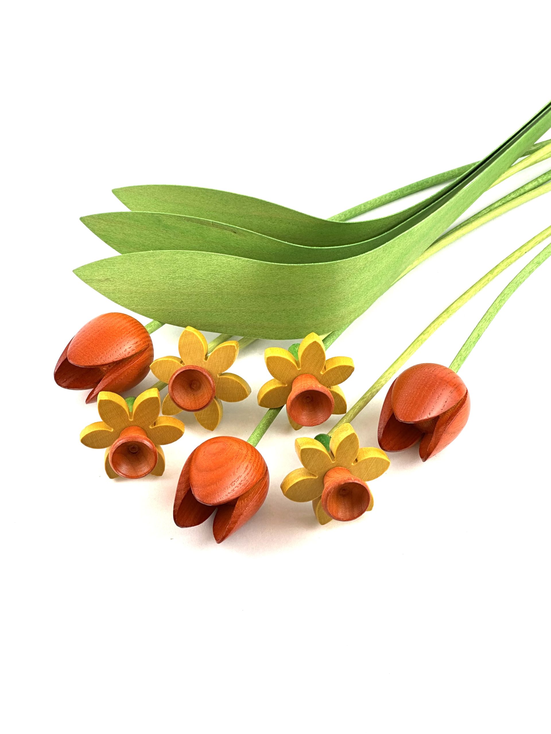 4 yellow homegrown hardwood daffodils with orange centres