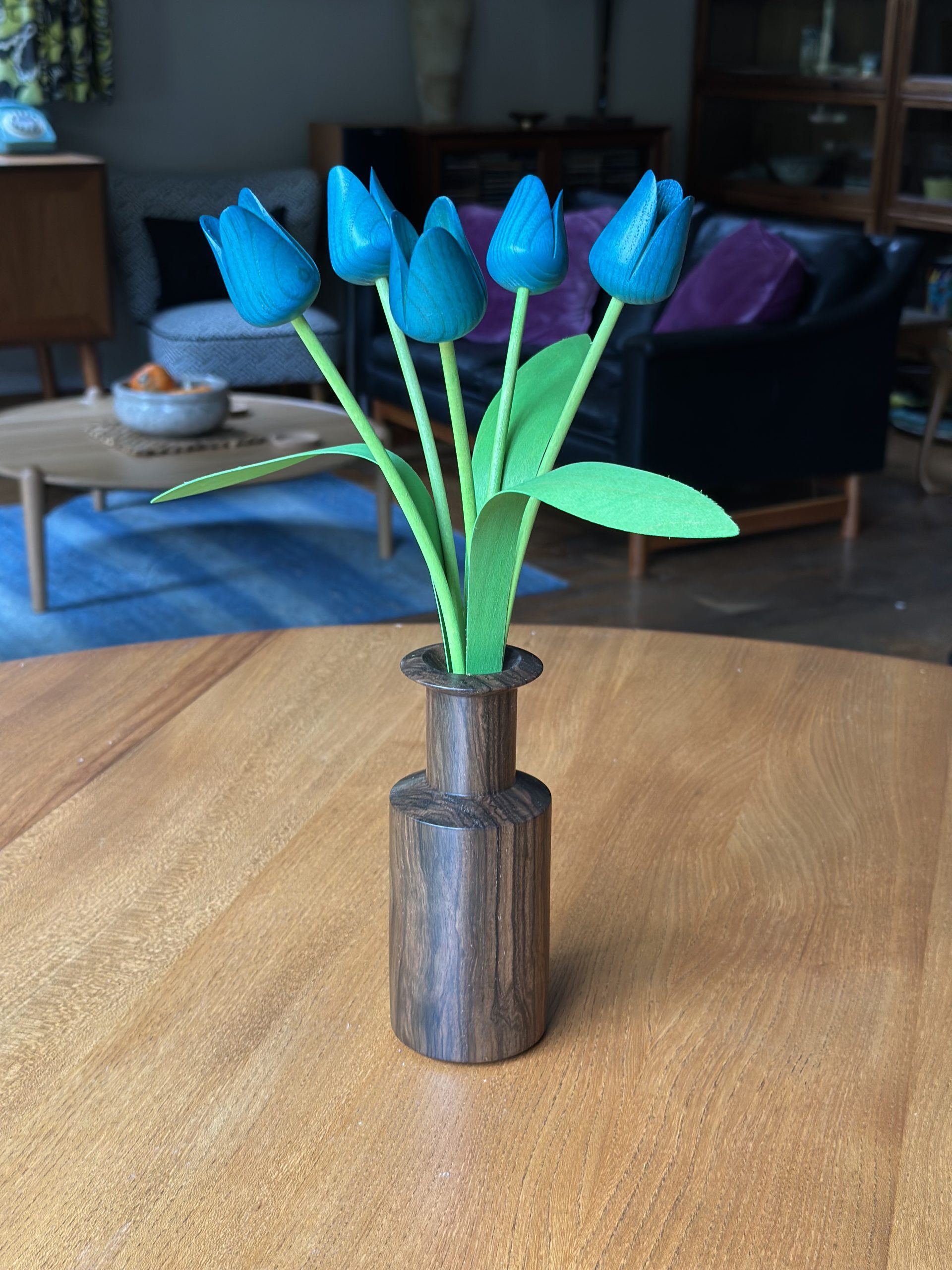 5 Turqoise new shape tulips with walnut “Neolist” vase